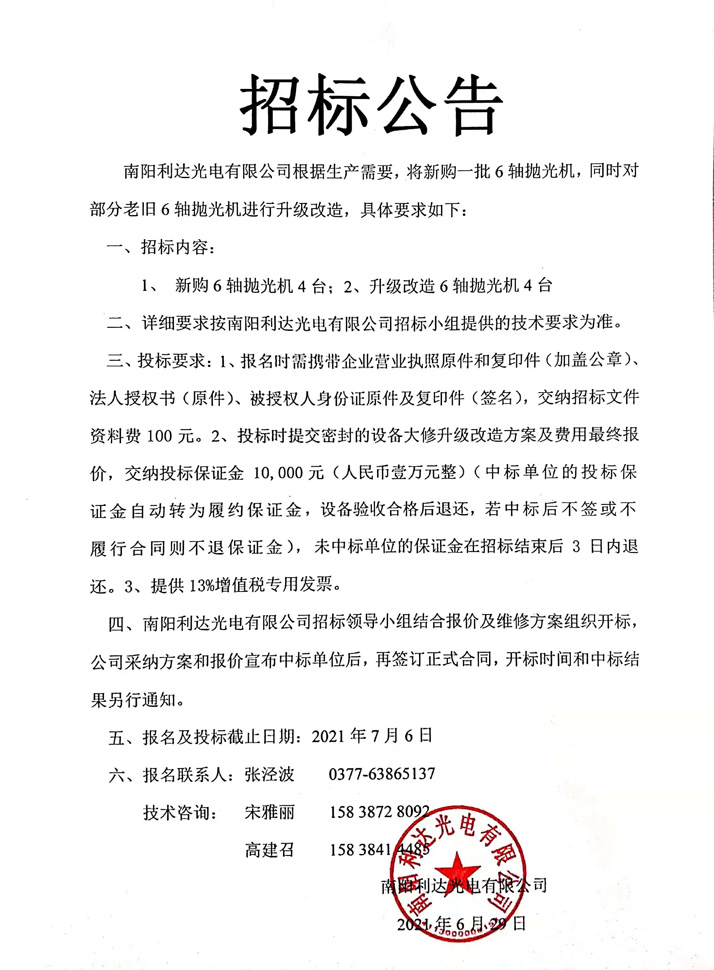 棱鏡事業(yè)部新購及升級改造6軸拋光機招標