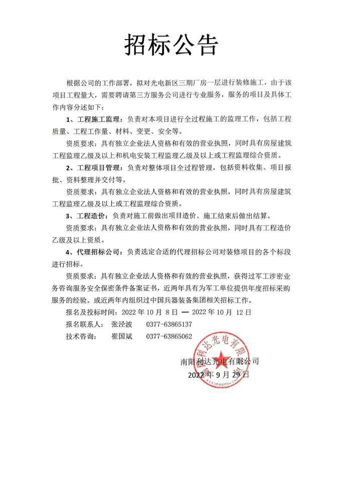 光電新區三期廠(chǎng)房一層裝修施工的招標公告