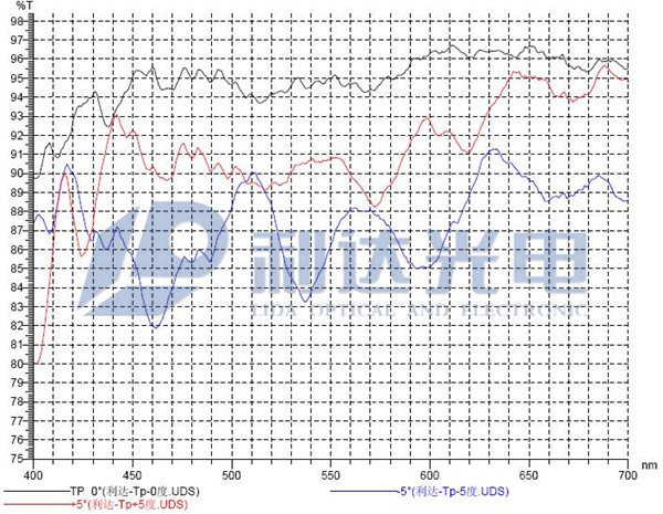 P光0°入射 420 ~680nm Tp(平均)≥94%; 440 ~640nm Tp(絕對)≥90% ± 5° Tp(平均)≥86%。